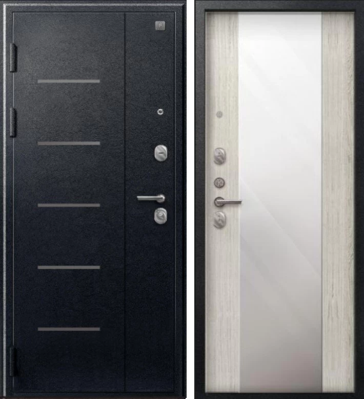 Надежная входная Дверь V-04 Черный муар - Полярный дуб Зеркало премиум класса по цене 38 100 руб. Большая толщина стали защитит от проникновения в ваш дом, квартиру или коттедж. Используется очень качественная фурнитура: замки, цилиндры, ручки, защелки. Покрытие и отделка двери изготовлено под внимательным контролем производителя. Дверь имеет долгий срок службы и гарантию.